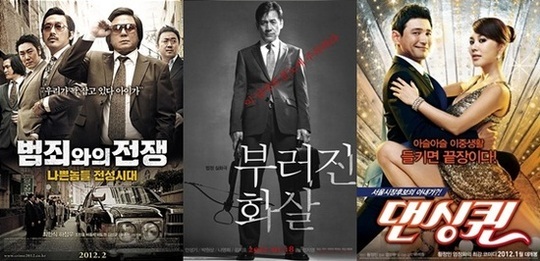 통상 비수기로 불리는 2월 박스오피스를 달구고 있는 영화들은 '범죄와의 전쟁 : 나쁜놈들 전성시대'(이하 '범죄와의 전쟁'), '댄싱퀸', '부러진 화살' 등 세 영화다. 이 세 작품은 극장가 '3파전'이라고 부를 수 있을 만큼 극장가를 휘어잡고 있다.