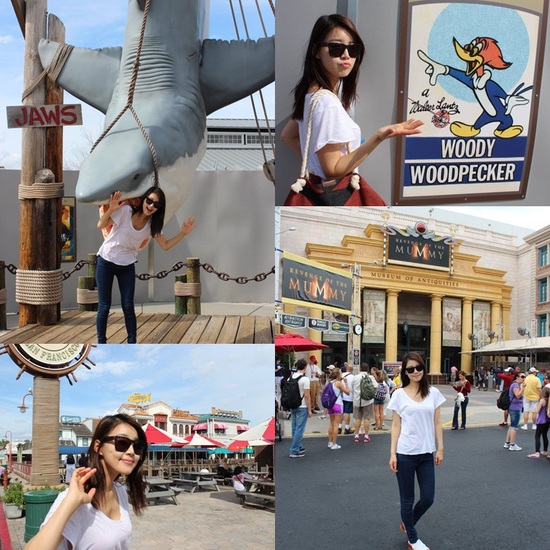 또한 한지혜는 미국 플로리다에 위치한 유니버설 스튜디오를 관광하면서 죠스 모형과 만화 캐릭터 앞에서 장난기 가득한 표정과 포즈를 취해 보는 이의 미소를 자아낸다.