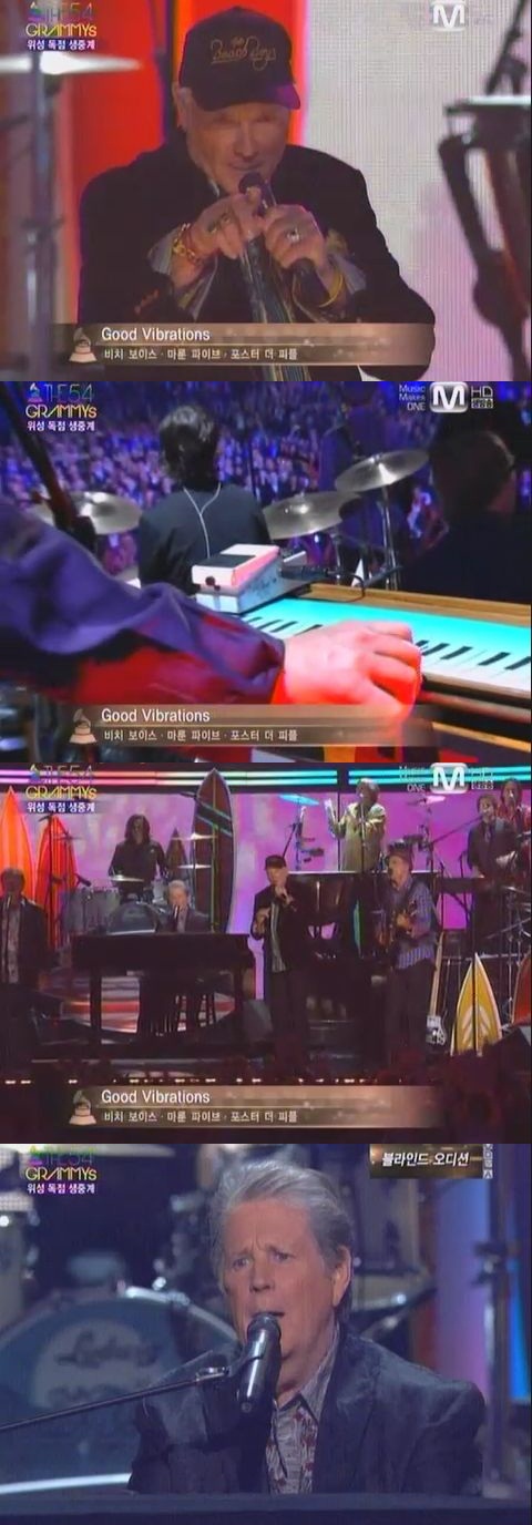 13일(한국시간) 미국 LA 스테이플 센터에서 열린 제54회 그래미 어워즈가 열린 가운데, 지난 1961년 결성돼 50여년간 음악 활동을 하고 있는 비치보이스가 후배 밴드 마룬파이브, 포스터 더 피플과 합동 공연을 펼쳤다.