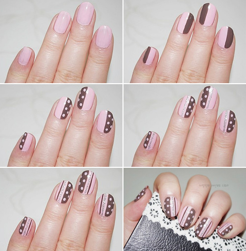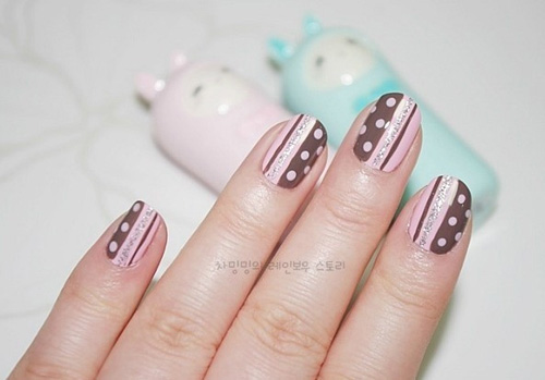 좀 더 세련된 느낌으로 러블리 핑크 초코 네일아트를 연출하고자 한다면 엄지, 중지 소지와는 반대로 검지, 약지의 바탕 컬러를 대비되게 하는 것이 좋다.
