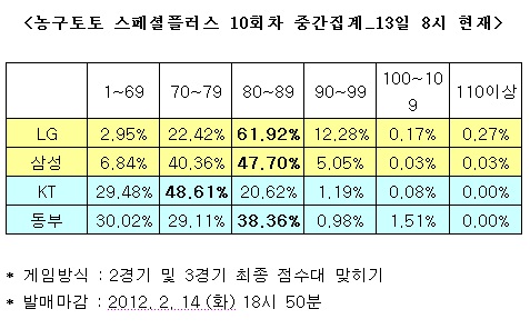 KT-동부(2경기)전에서는 동부는 80점대 예상이 38.36%, KT는 70점대 예상이 48.61%로 가장 높게 집계돼 동부의 승리가 예상됐다. 농구토토 스페셜플러스 게임은 대상경기의 최종 득점대를 예상해 맞히는 방식이다. 더블은 1~2번 경기 4팀, 트리플은 1~3번 경기 6팀의 최종 득점대를 맞혀야 한다. 농구토토 스페셜플러스 10회차 게임은 1경기 시작 10분 전인 14일 오후 6시 50분에 발매가 마감된다.