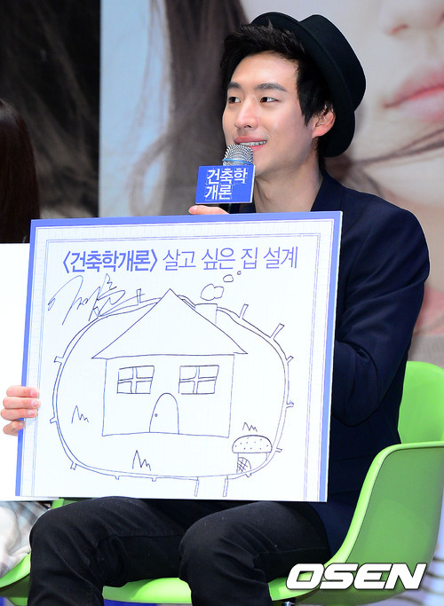 13일 오전 서울 롯데시네마 건대입구점에서 열린 영화 ‘건축학 개론’제작보고회에서 자신이 살고 싶은 집을 그리는 시간에서 이제훈이 자신의 그림에 대해 설명하고 있다.