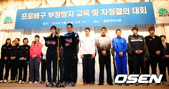 승부조작으로 몸살을 앓고 있는 한국배구연맹(KOVO)이 13일 오후 서울 송파구 방이동 올림픽파크텔에서 전 구단 프런트 및 선수단이 참여해 부정방지 교육 및 자정 결의 대회를 가졌다.