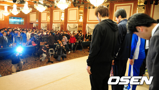각 구단 감독과 주장 선수들이 대표로 무대에 올라 승부조작과 관련 부정 방지를 위한 다짐의 인사를 하고 있다.