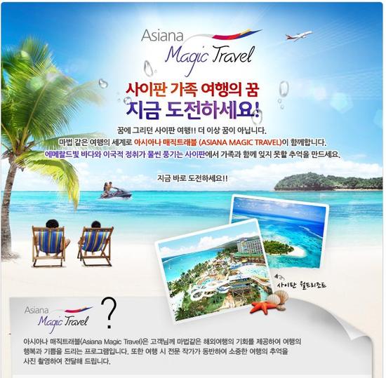 사이판을 비롯한 티니안, 로타 등 3개 섬으로 구성된 마리아나 제도의 마리아나 관광청이 아시아나 항공 및 사이판 월드리조트와 함께 2월 10일부터 한 달간 사이판 가족 여행권을 제공하는 ‘아시아나 매직 트래블-사이판’ 이벤트를 연다.