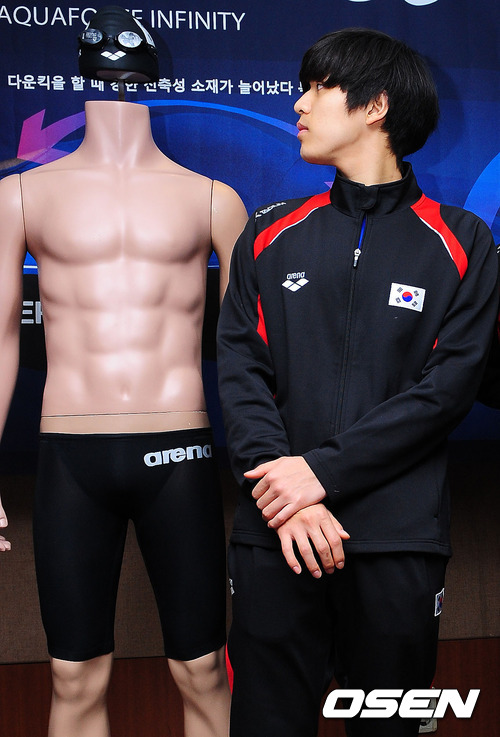14일 오전 서울 송파구 방이동 올림픽파크텔 아레나홀에서 열린 2012 런던올림픽 한국 수영 국가대표팀 출전 수영복 공개 행사에서 최규웅이 수영복을 바라보고 있다.
