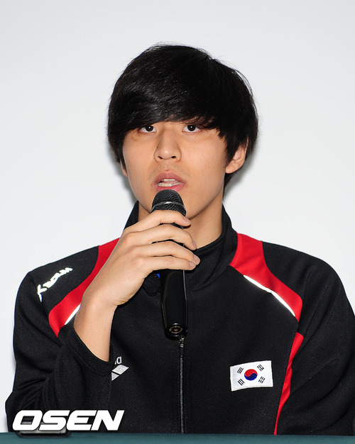 14일 오전 서울 송파구 방이동 올림픽파크텔 아레나홀에서 열린 2012 런던올림픽 한국 수영 국가대표팀 출전 수영복 공개 행사에서 최규웅이 기자회견을 하고 있다.
