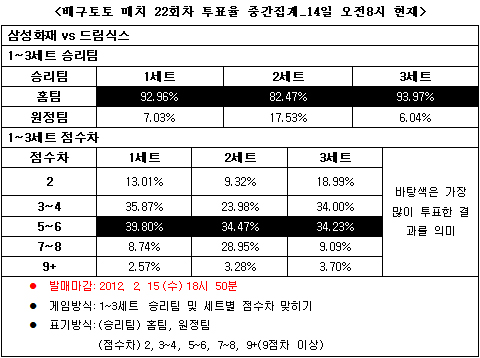 2011-12시즌 프로배구 대상 배구토토 매치 22회차 중간집계 결과. 1-3세트 모두 삼성화재 승리 예상…15일 오후 6시 50분 발매 마감