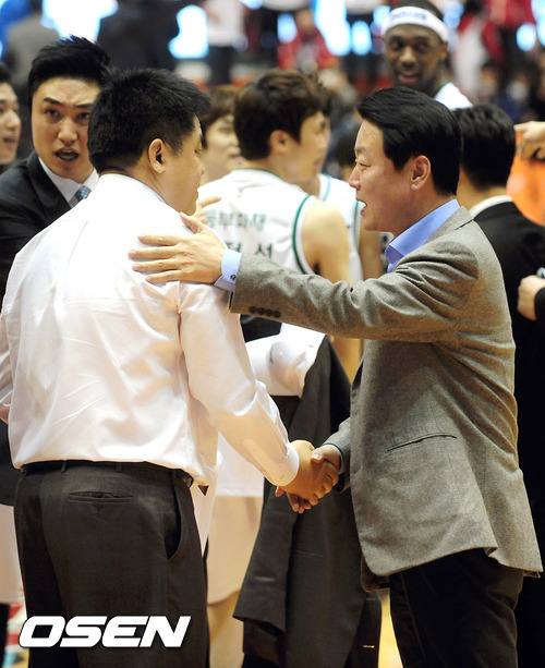 경기 종료 후 KBL 한선교 총재가 동부 강동희 감독에게 축하하고 있다. / soul1014@osen.co.kr