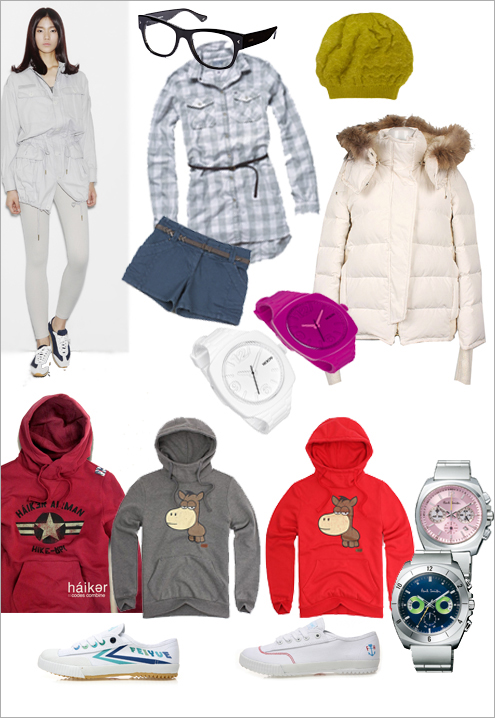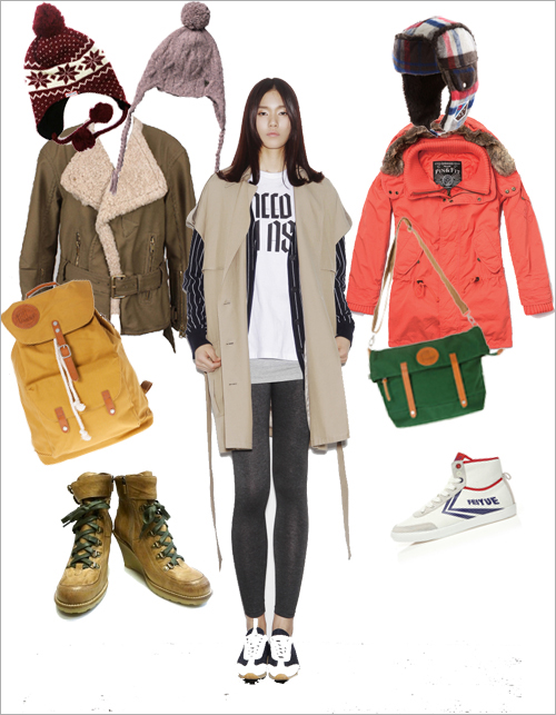 기본적으로는 패딩 점퍼, 스웨터 티셔츠, 컬러풀한 운동화 등의 아이템으로 꾸민 듯 안 꾸민 듯 내추럴한 모습을 연출하면 된다. 예를 들면 캐릭터 티셔츠에 짧은 쇼츠와 레깅스를 착용한 후 컬러감이 있는 패딩점퍼와 양털 부츠를 신는 것이다. 단, 패딩 점퍼를 선택할 때는 몸에 딱 맞게 피트 되는 것이어야 한다.