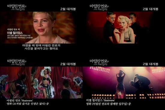 또 영화 '쇼처럼 즐거운 인생은 없다'에서 'Heatwave'를 부르는 실제 마릴린 먼로의 모습과 함께 '마릴린 먼로와 함께한 일주일'에서 같은 노래를 부르고 있는 미셸 윌리엄스의 모습을 연이어 보여주면서 두 사람이 얼마나 닮았는가를 다시 한 번 확인시킨다.