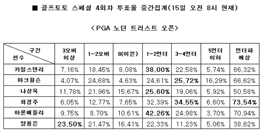 국내 골프팬들은 2012 PGA 노던 트러스트 오픈에서 최경주의 언더파 가능성을 가장 높게 점쳤다.