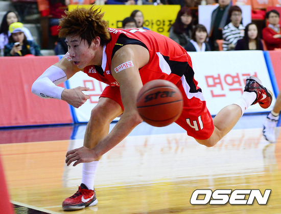 15일 오후 안양 실내체육관에서 열린 '2011-2012 KB국민카드 프로농구' 안양 인삼공사와 인천 전자랜드의 경기 3쿼터 인삼공사 오세근이 볼을 살리기 위해 몸을 날리고 있다.