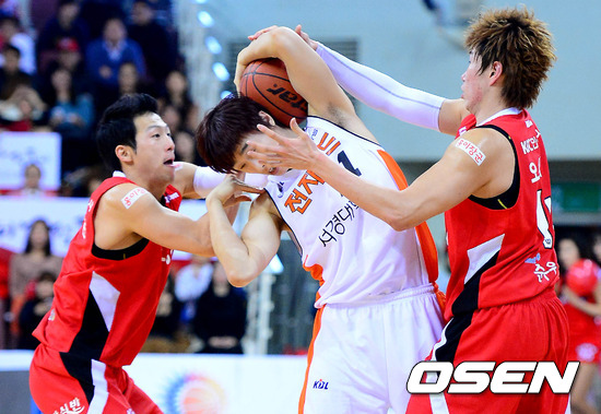 15일 오후 안양 실내체육관에서 열린 '2011-2012 KB국민카드 프로농구' 안양 인삼공사와 인천 전자랜드의 경기 4쿼터 전자랜드 함누리가 인삼공사 오세근 이정현의 수비에 막히고 있다.