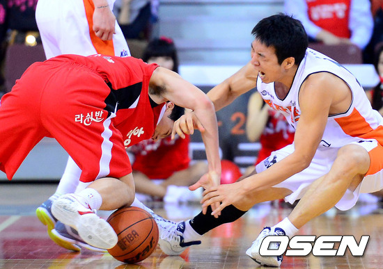 15일 오후 안양 실내체육관에서 열린 '2011-2012 KB국민카드 프로농구' 안양 인삼공사와 인천 전자랜드의 경기 4쿼터 인삼공사 이정현과 전자랜드 이현호가 루즈볼 다툼을 하고 있다.