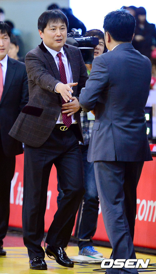 15일 오후 안양 실내체육관에서 열린 '2011-2012 KB국민카드 프로농구' 안양 인삼공사와 인전 전자랜드의 경기 종료 후 인삼공사 이상범 감독과 전자랜드 유도훈 감독이 악수를 나누고 있다.