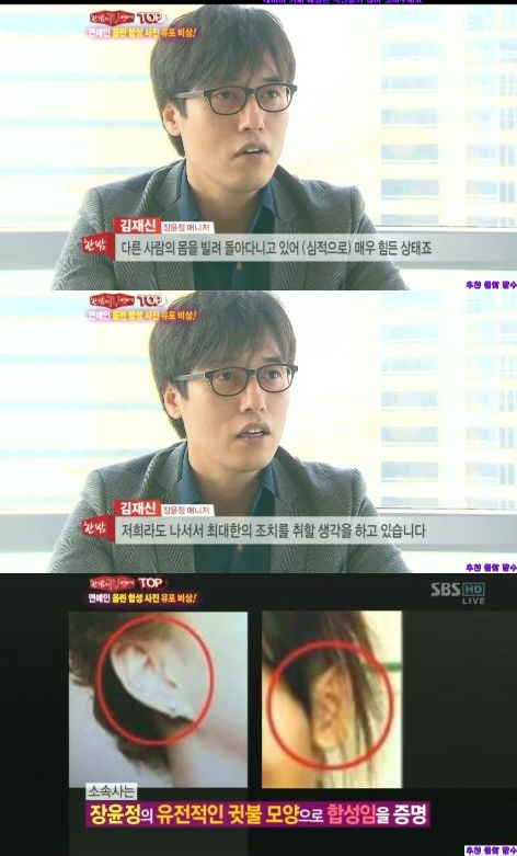장윤정 매니저 김재신씨는 15일 오후 8시 50분 방송된 SBS '한밤의 TV연예'에 출연해 장윤정의 이름으로 사칭 음란 사진이 유포된 데에 대한 소속사 측의 입장을 전했다.