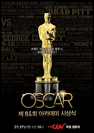 채널CGV는 한국 시간으로 오는 27일 오전 10시부터 오후 2시까지 4시간에 걸쳐 미국 LA 할리우드 코닥 극장에서 진행되는 ‘제 84회 아카데미 시상식’의 전 과정을 생생하게 국내 시청자들에 전할 예정이다.