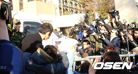 16일 오전 서울 용산구 국방부 앞에서 배우 이준기가 팬들에게 인사를 하고 있다.