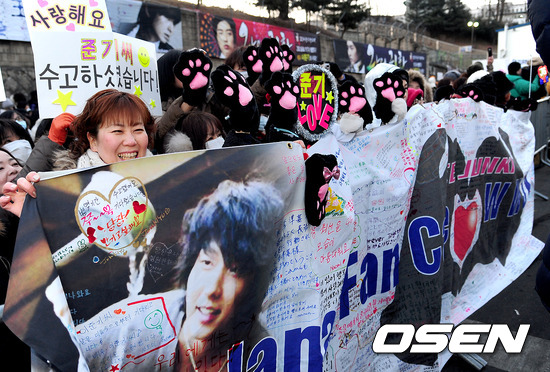 16일 오전 서울 용산구 국방부 앞에서 이준기 팬들이 이준기를 기다리고 있다