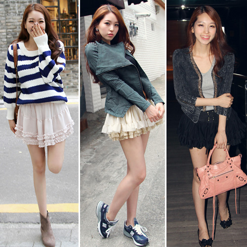 레이스와 러플이 과장되고 허벅지가 드러나는 짧은 길이의 스커트는 재기 발랄한 매력을 선보이기에 좋다.
