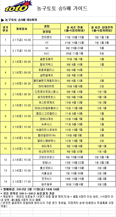 한편, KBL에서는 18일 오후 5시 KCC-동부(14경기)전에서 정규리그 우승을 사실상 확정 지은 동부가 승리할 것(43.08%)이라는 전망이 가장 높게 집계됐다. SK-KGC(2경기)전에서는 2위 KGC가 승리(76.84%)해 올 시즌 SK를 상대로 6전승을 거둘 것으로 예상됐다. 농구토토 승5패 6회차 게임은 17일 오후 6시 50분에 발매가 마감된다.