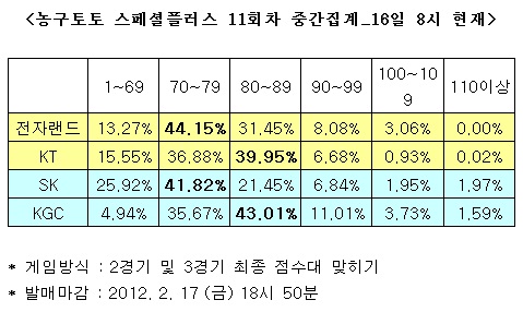 [농구토토] 국민체육진흥공단(www.kspo.or.kr)이 발행하는 체육진흥투표권 수탁사업자인 스포츠토토 공식 온라인 발매 사이트인 베트맨(www.betman.co.kr)은 17일 펼쳐지는 전자랜드-KT(1경기)전, SK-KGC(2경기)전 등 국내 프로농구 2경기를 대상으로 한 농구토토 스페셜플러스 11회차 투표율 중간집계 결과, 참가자들은 2경기 SK-KGC전에서 2위 KGC의 승리를 예상했다고 밝혔다.