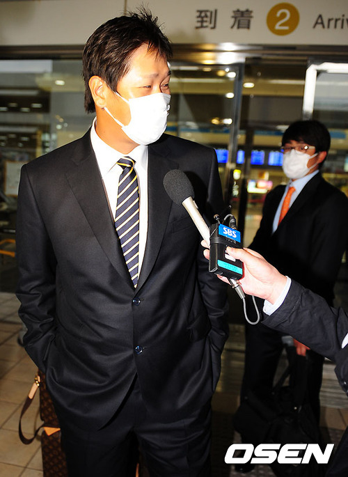 17일 오후 오릭스 버팔로스의 이대호가 미야코지마 캠프를 마치고 연습경기를 갖기 위해 일본 오키나와에 도착, 나하공항 입국장을 나서며 취재진과 인터뷰를 하고 있다.