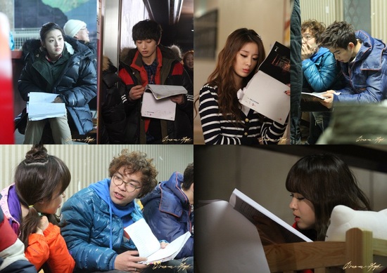 KBS 2TV 월화드라마 '드림하이2'의 출연배우 강소라, 정진운, 박지연, 주니어(Jr.), 김지수, 유소영이 앉으나 서나, 심지어 누워서도 대본을 손에서 놓지 않는 열정을 보여주는 현장 스틸이 화제다. 특히, 박지연의 시크한 대본 읽기, 유소영의 침대 대본 읽기 등 각 캐릭터에 맞는 갖가지 모습이 웃음을 자아내게 한다.