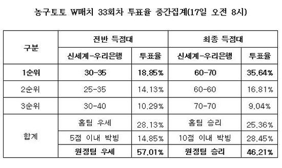 농구토토 W매치 33회차는 경기시작 10분전인 18일 오후 4시 50분 발매가 마감된다.