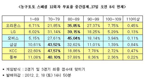 [농구토토] 국민체육진흥공단(www.kspo.or.kr)이 발행하는 체육진흥투표권 수탁사업자인 스포츠토토 공식 온라인 발매 사이트인 베트맨(www.betman.co.kr)은 오는 18일 펼쳐지는 오리온스-LG(1경기)전, 모비스-삼성(2경기)전, KCC-동부(3경기)전 등 국내 프로농구 3경기를 대상으로 한 농구토토 스페셜 12회차 투표율 중간집계 결과, 참가자들은 3경기 KCC-동부전에서 양 팀간 접전을 내다봤다고 전했다.