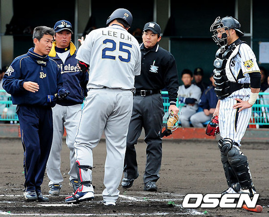 2회초 무사에서 오릭스 이대호가 손에 맞았다며 주심에게 항의하고 있다. 하지만 항의는 받아들여 지지 않았고 이대호는 볼넷으로 출루했다./jpnews@osen.co.kr