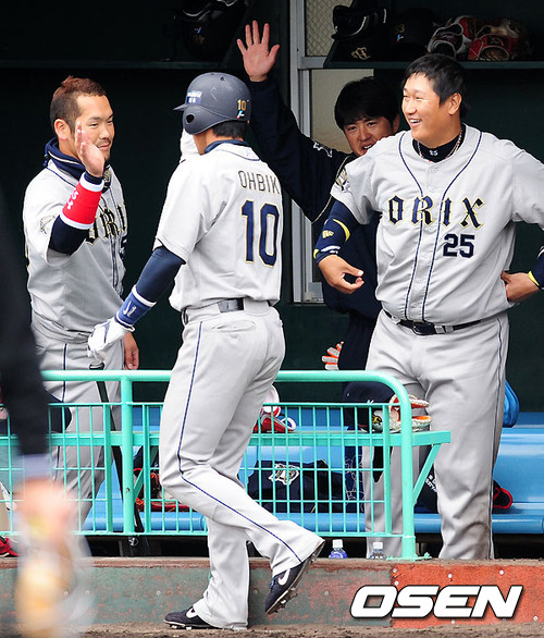 4회초 2사 1,2루에서 오릭스가 적시타를 날리며 득점에 성공하자 이대호가 더그아웃에서 동료선수들과 하이파이브를 하고 있다./jpnews@osen.co.kr