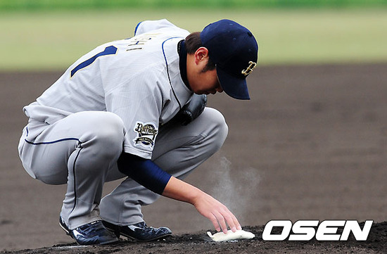 선발투수로 나선 오릭스 니시 유키가 로진백을 만지고 있다./jpnews@osen.co.kr