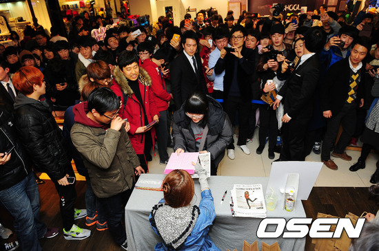 18일 오후 경기도 부천시 현대백화점 중동점 유플렉스 프레디 매장에서 열린 박하선 사인회에서 박하선이 팬에게 선물을 받고 있다.