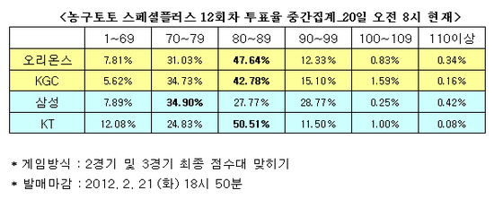 국내 프로농구 2경기 대상 농구토토 스페셜플러스 12회차 투표율 중간집계