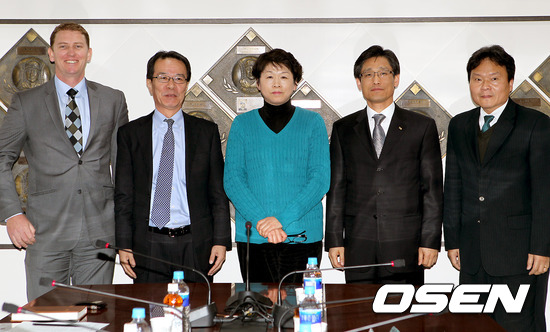 20일 오후 서울 도곡동 야구회관에서 진행된 아시아시리즈 참가 5개국 사무총장 회의에서 벤포스터 호주프로야구 단장(왼쪽부터), 시모다 일본프로야구 사무국장, 쉔웨이 중국야구협회 사무총장, 양해영 한국프로야구 사무총장, CPBL(중화직업봉구대연맹) 사무총장이 포즈를 취하고 있다.