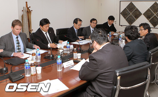 20일 오후 서울 도곡동 야구회관에서 진행된 아시아시리즈 참가 5개국 사무총장 회의에서 벤포스터 호주프로야구 단장(왼쪽부터), 시모다 일본프로야구 사무국장, 쉔웨이 중국야구협회 사무총장, 양해영 한국프로야구 사무총장, CPBL(중화직업봉구대연맹) 사무총장이 모인 가운데 회의가 진행되고 있다.