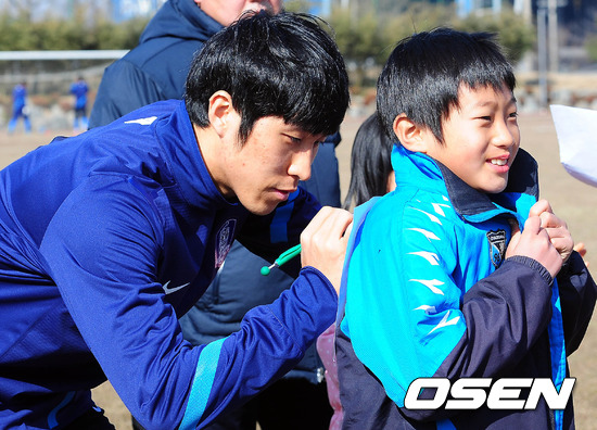20일 오후 전남 영암군 현대삼호중공업 사계절잔디구장에서 열린 축구대표팀 훈련에서 한상운이 한 소년팬에게 사인을 해주고 있다.