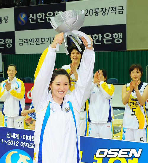 20일 오후 경기도 안산 와동체육관에서 열린 신세계 이마트 2011~2012 여자프로농구 안산 신한은행과 청주 KB국민은행과의 경기를 마치고 열린 신한은행이 정규리그 우승 축하행사에서 신한은행 강영숙이 정규리그 우승트로피를 들어올리고 있다.
