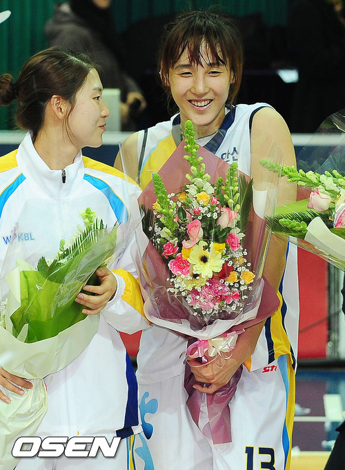 20일 오후 경기도 안산 와동체육관에서 열린 신세계 이마트 2011~2012 여자프로농구 안산 신한은행과 청주 KB국민은행과의 경기를 마치고 열린 신한은행이 정규리그 우승 축하행사에서 신한은행 김단비가 윤미지와 즐겁게 얘기를 나누고 있다.
