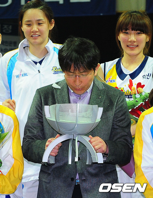 20일 오후 경기도 안산 와동체육관에서 열린 신세계 이마트 2011~2012 여자프로농구 안산 신한은행과 청주 KB국민은행과의 경기를 마치고 열린 신한은행이 정규리그 우승 축하행사에서 신한은행 임달식 감독이 정규리그 우승 트로피 안에 들어간 색종이를 불어내고 있다.