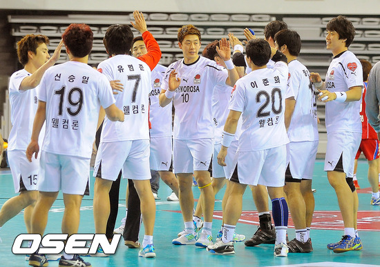 20일 서울 올림픽공원 내 SK핸드볼경기장에서 열린 '2012 SK핸드볼코리아리그' 남자부 경기서 김성헌 감독이 이끄는 웰컴론코로사가 충남체육회에 24-22 진땀승을 거뒀다. 8골을 넣은 김장문과 7골을 넣은 정수영이 웰컴론코로사의 승리를 이끈 주역이었다. 김장문은 이날 MVP로 선정되며 승리의 기쁨에 MVP의 영광까지 누렸다.