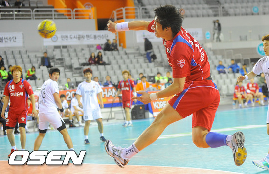 20일 서울 올림픽공원 내 SK핸드볼경기장에서 열린 '2012 SK핸드볼코리아리그' 남자부 경기서 김성헌 감독이 이끄는 웰컴론코로사가 충남체육회에 24-22 진땀승을 거뒀다. 8골을 넣은 김장문과 7골을 넣은 정수영이 웰컴론코로사의 승리를 이끈 주역이었다. 김장문은 이날 MVP로 선정되며 승리의 기쁨에 MVP의 영광까지 누렸다.
