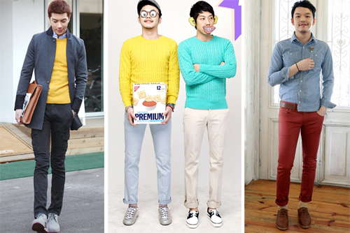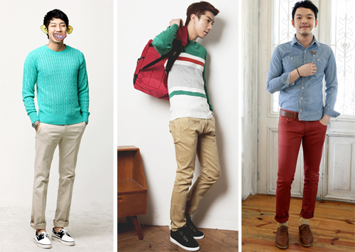 반대로 팬츠를 비비드하게 입는 것도 좋다. 와인 컬러는 레드처럼 너무 강하지 않고 적당히 스타일에 포인트 주기도 쉽기 때문에 의외로 남자들이 즐겨 입는 팬츠 중 하나이다.