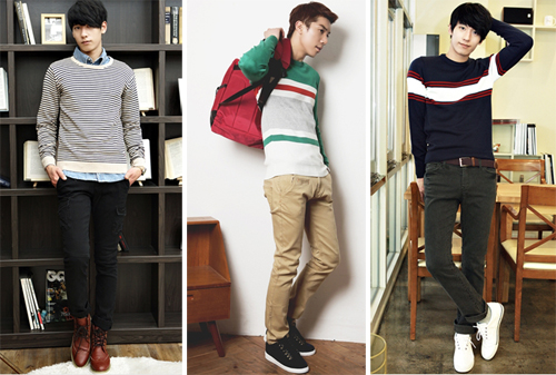 상의는 스트라이프 패턴이 들어간 니트가 심심하지 않고 한결 세련된 스타일링을 완성해 준다. 이너에 셔츠를 레이어드해서 입는 것도 감각 있어 보이는 좋은 코디법이다.
