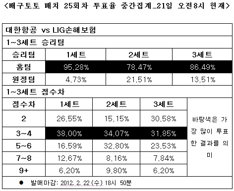 [배구토토] 국민체육진흥공단(www.kspo.or.kr)이 발행하는 체육진흥투표권 수탁사업자인 오리온그룹 계열의 스포츠토토 공식 온라인 발매사이트 베트맨(www.betman.co.kr)이 오는 22일 오후 7시 인천도원체육관에서 열리는 대한항공-LIG손해보험전 대상 배구토토 매치 25회차 게임 투표율을 중간집계한 결과, 국내 배구팬들은 리그 2위 대한항공의 승리를 예상했다고 전했다.