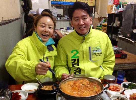 그룹 투투 출신의 방송인 황혜영이 남편 김경록 민주통합당 전 부대변인의 안양 동안갑 지역구 총선 출마에 힘을 보태고 있다.