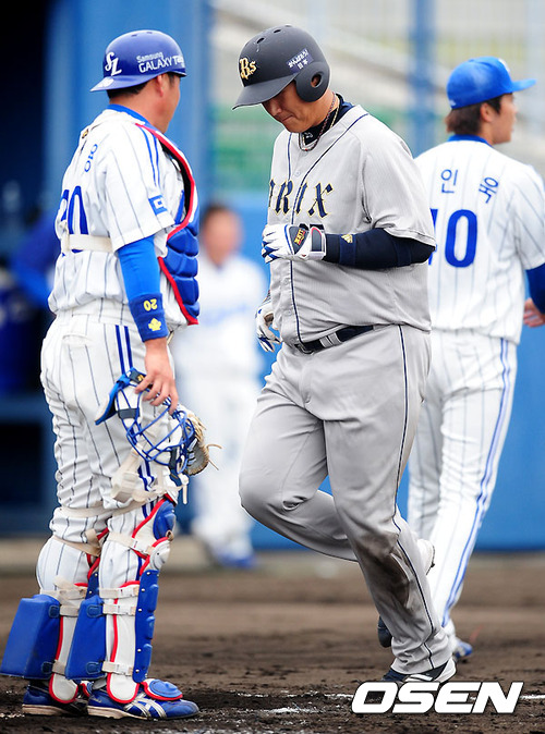 4회초 1사 1,3루에서 오릭스 이대호가 마쓰마타의 외야플라이에 홈을 밟고 있다.