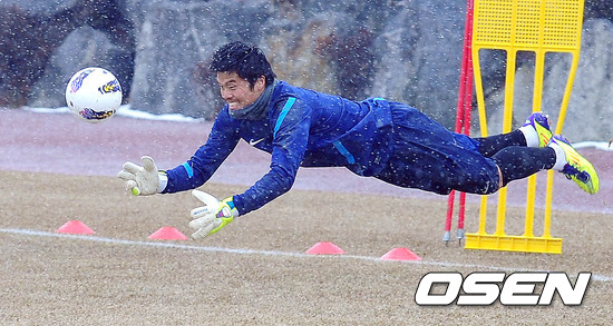 21일 오후 전남 영암군 현대삼호중공업 사계절잔디구장에서 열린 축구대표팀 훈련 셋 째날, 김영광이 몸을 날려 볼을 잡고 있다.